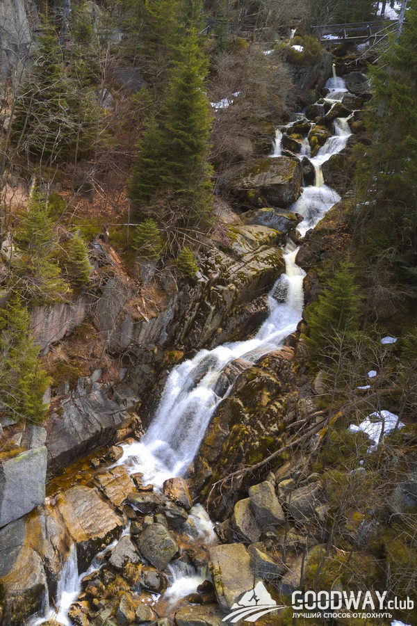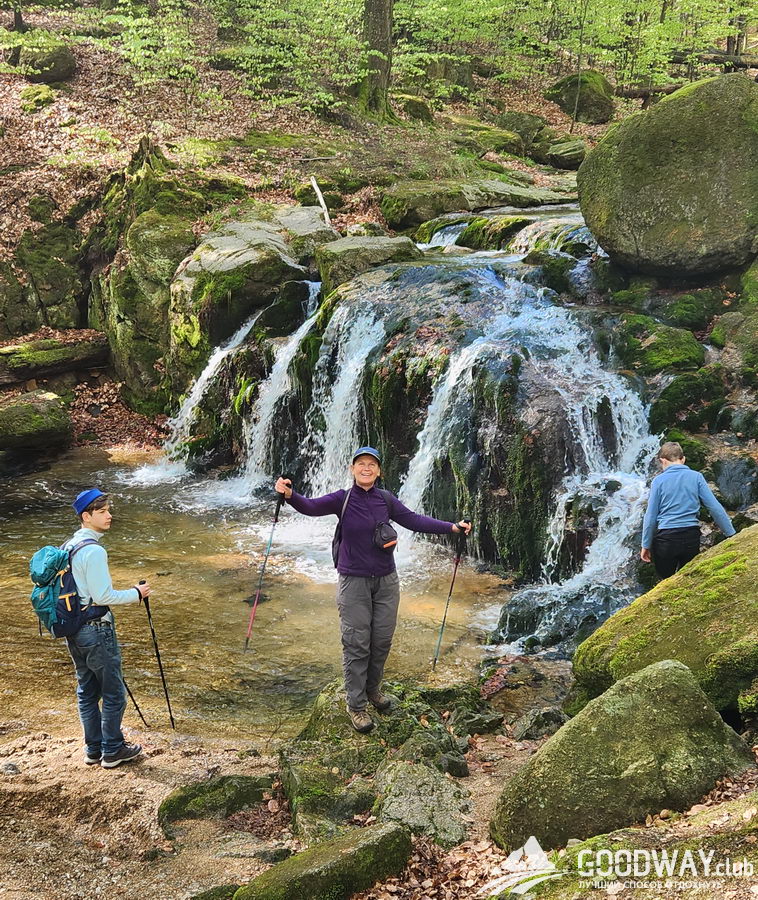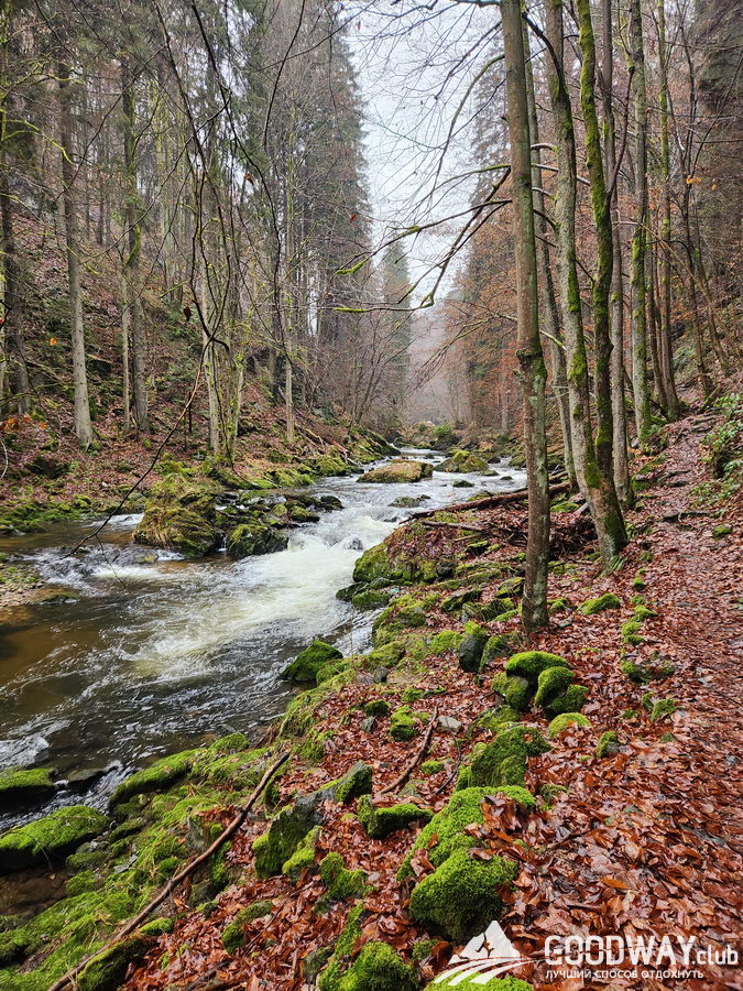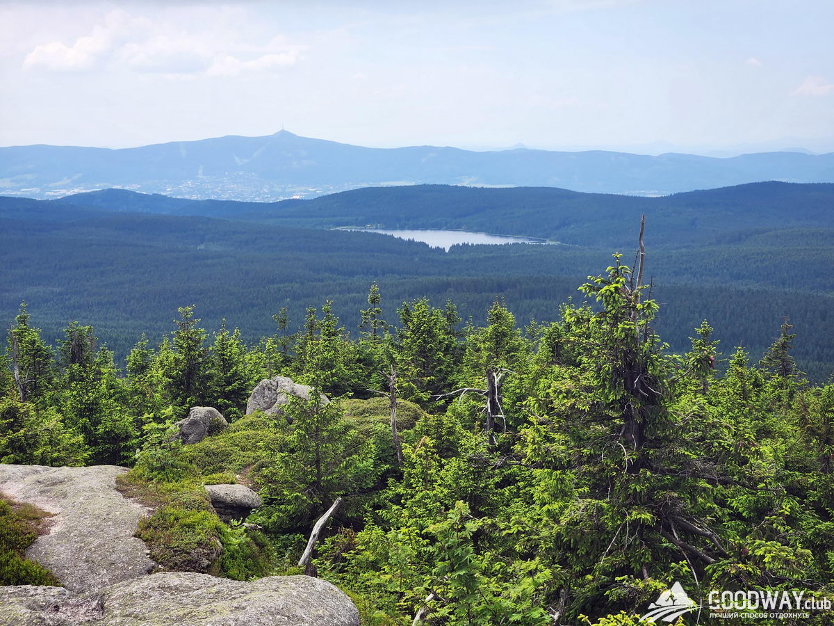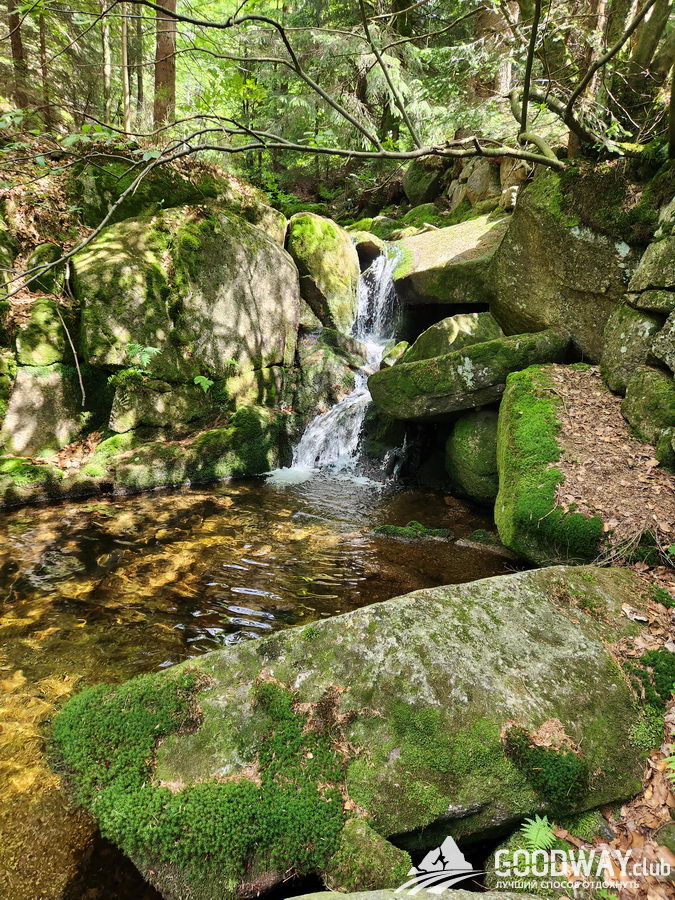 Сегодня будет красивый трек по Йизерским горам. Начнём с культурной части – монастыря 17 века. Хорошо отреставрирован, красиво выглядит на фоне гор. Подъём вверх будет по лесу вдоль горной речки с перекатами и водопадами. Красивая, приятная тропа. Выходим на плато, как раз в обеденное время попадётся кафе. Дальше ещё небольшой подъём через черничные заросли, и мы на горе Голубник 1071м. Прекрасная смотровая площадка, хорошо виден Йештед. Это будет наивысшая точка всего тура. Спускаться будем вдоль другой речки, ещё более богатой на водопады.