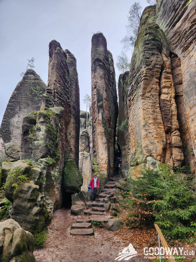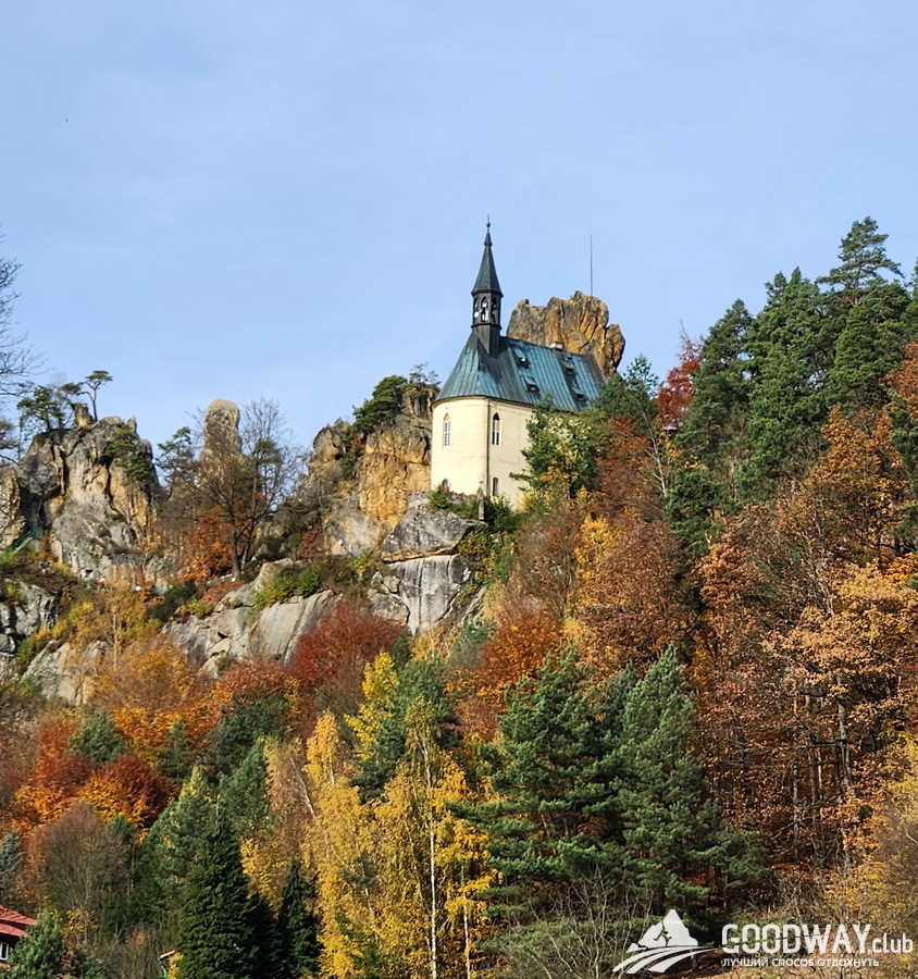 Отправляемся в район Мала Скала. Есть тут одноимённый замок, но он в частном владении и закрыт для туристов. Поэтому, заходить туда нет смысла, мы лучше сразу поднимемся на смотровую и насладимся просторами сверху. Далее будет крепость Вранов, в основном это выдолбленные в скале комнаты и проходы, но их тут много. Ещё есть очень живописная церквушка. С другой стороны горный хребет охраняет крепость Фридштейн. Здесь сохранилась зачётная высокая башня, куда ведут винтовые лестницы. Потом через поля и лес переходим в лабиринты Беседицких скал. Вот, здесь уже традиционные для Чешского рая песчаниковые башни и бесконечные смотровые. Селимся в городе Турнов, где будем остальные 3 ночи.