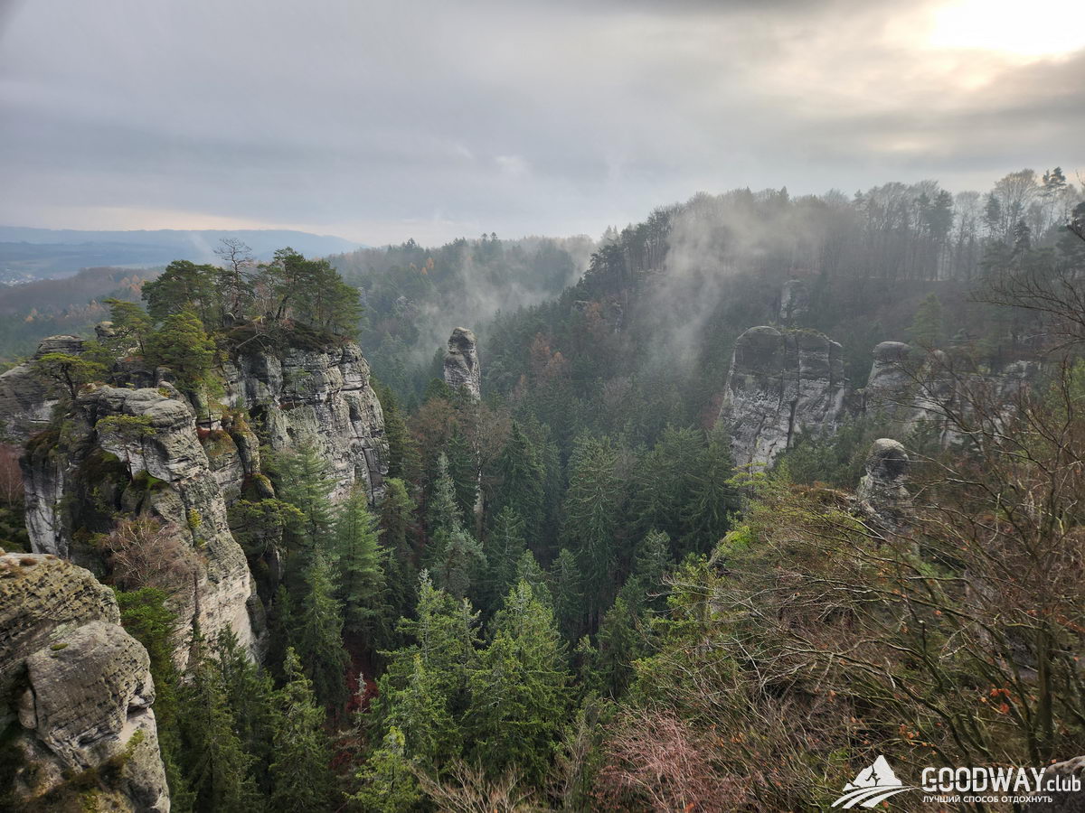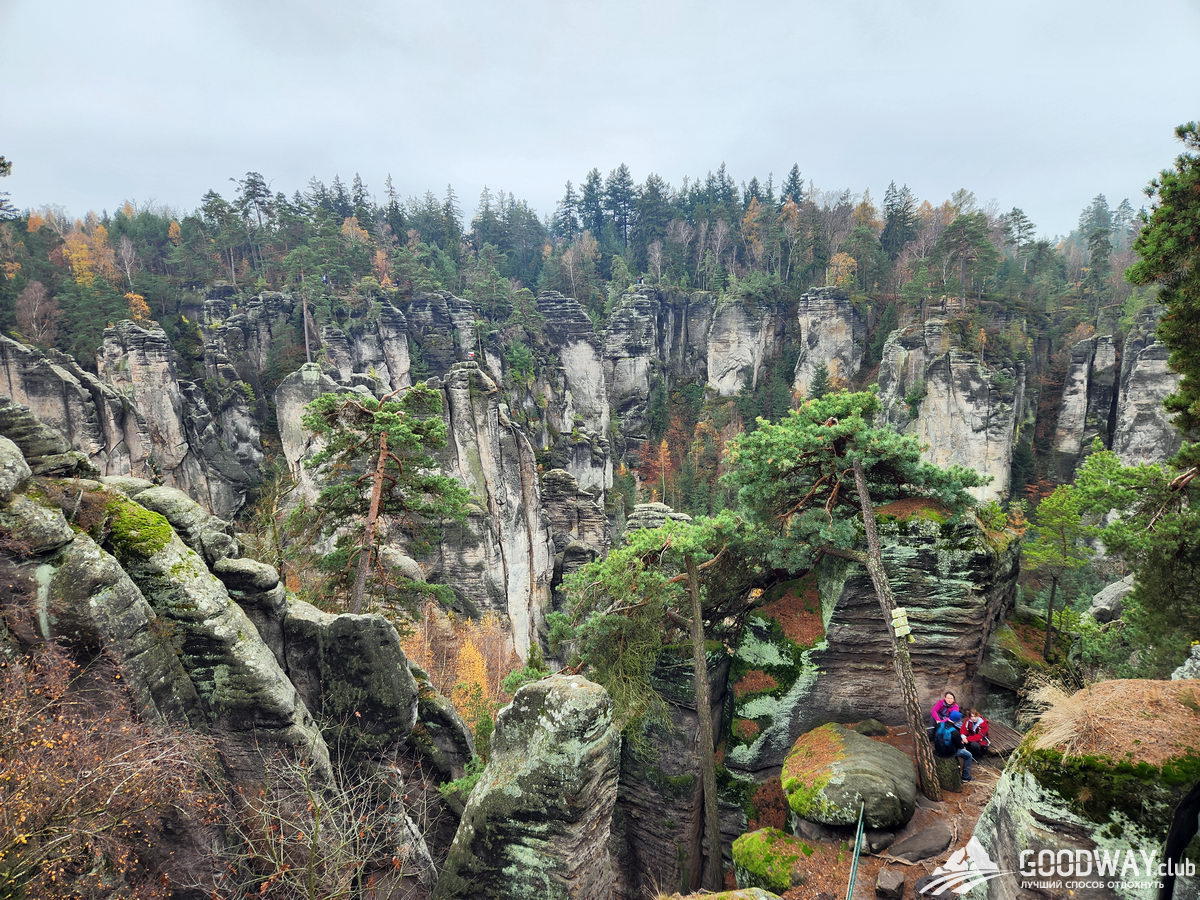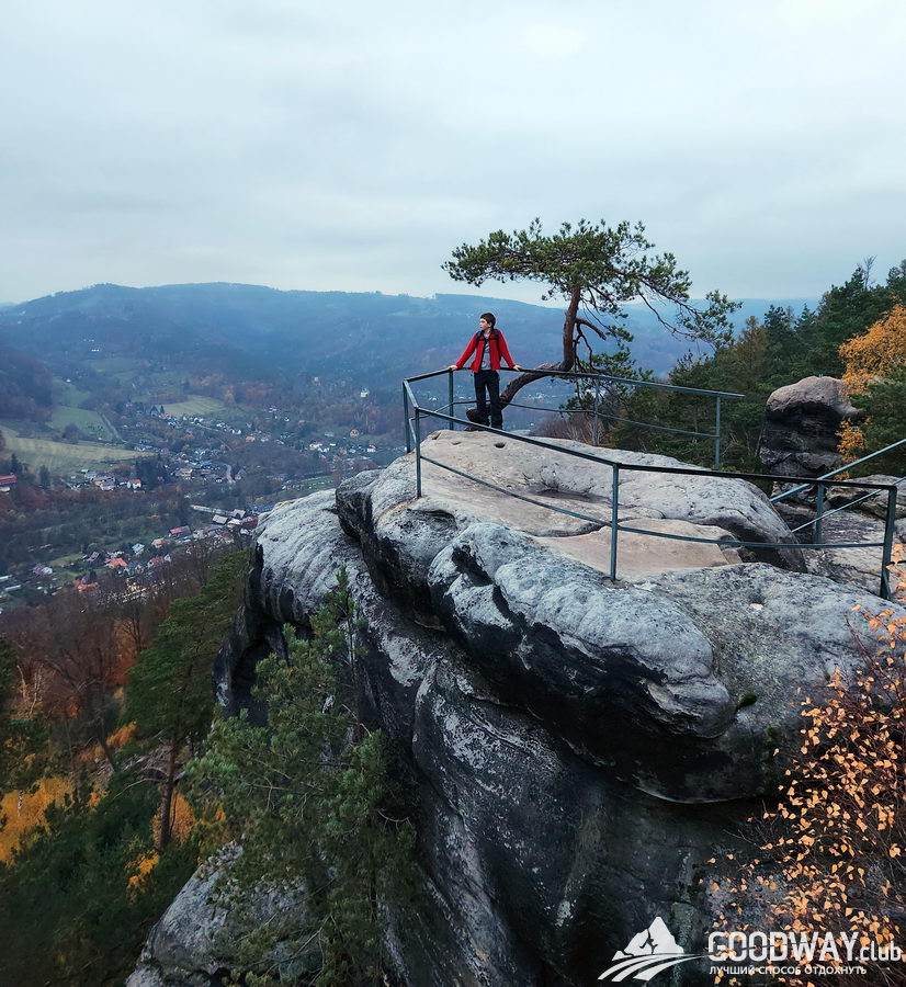 Начнём с осмотра галереи 3D картин, вырезанных в скалах. Им по 40-70 лет, а смотрятся, будто древние. Несколько десятков картин от местного мастера. Впечатляет. Дальше, через красивый лес и несколько смотровых площадок выходим к замку Груба скала. С 14 века здесь была крепость, а когда необходимость в ней пропала, перестроили в замок. Но, оставили в нём много военного духа – башни, бойницы. Смотрится отлично, и вид отсюда хороший!