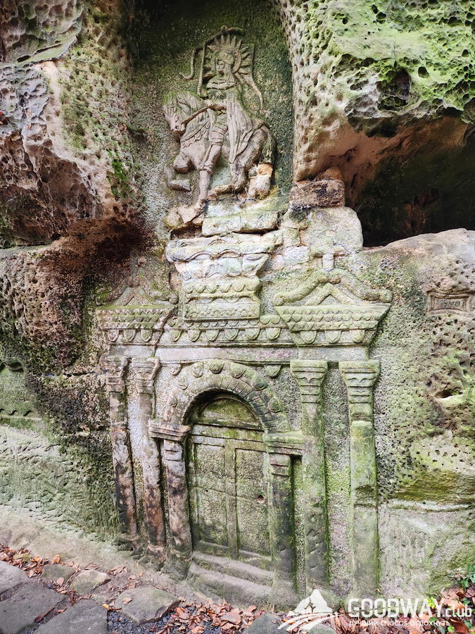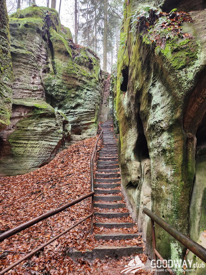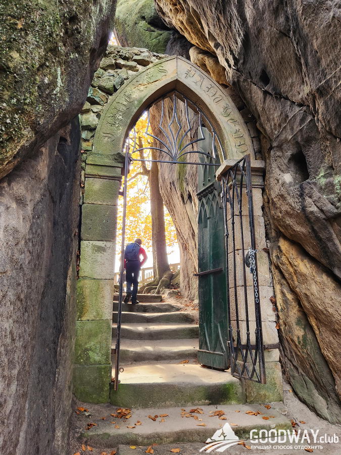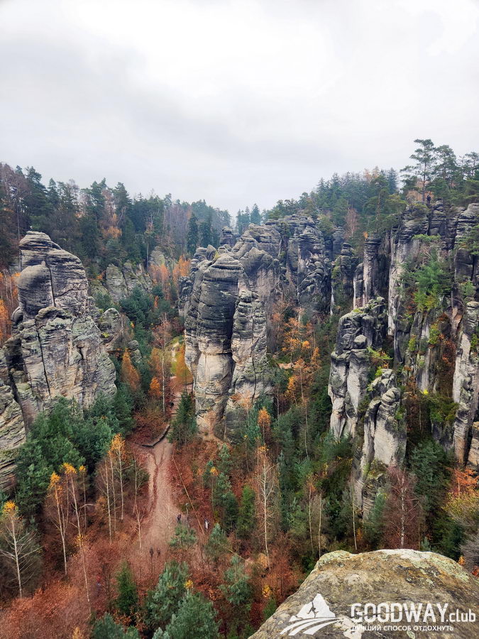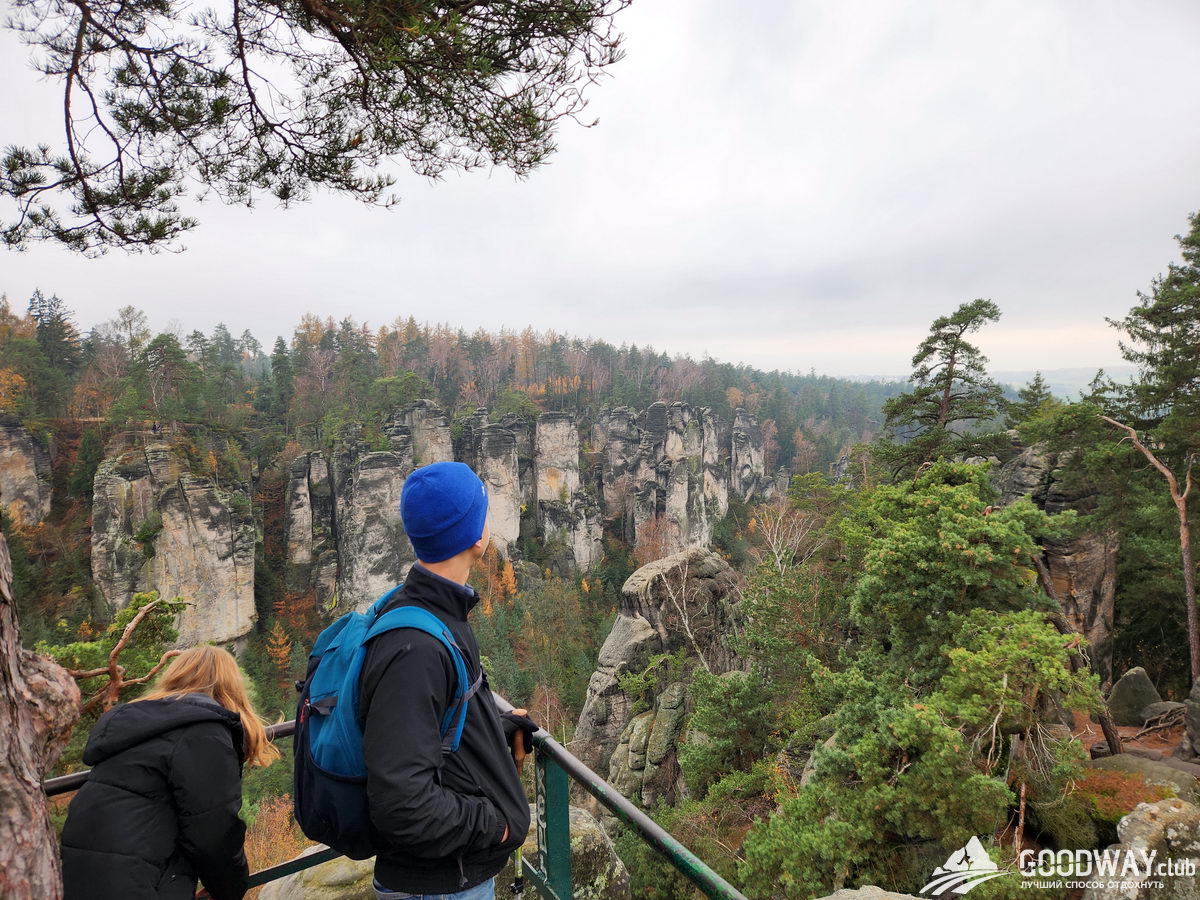 Начнём с осмотра галереи 3D картин, вырезанных в скалах. Им по 40-70 лет, а смотрятся, будто древние. Несколько десятков картин от местного мастера. Впечатляет. Дальше, через красивый лес и несколько смотровых площадок выходим к замку Груба скала. С 14 века здесь была крепость, а когда необходимость в ней пропала, перестроили в замок. Но, оставили в нём много военного духа – башни, бойницы. Смотрится отлично, и вид отсюда хороший!