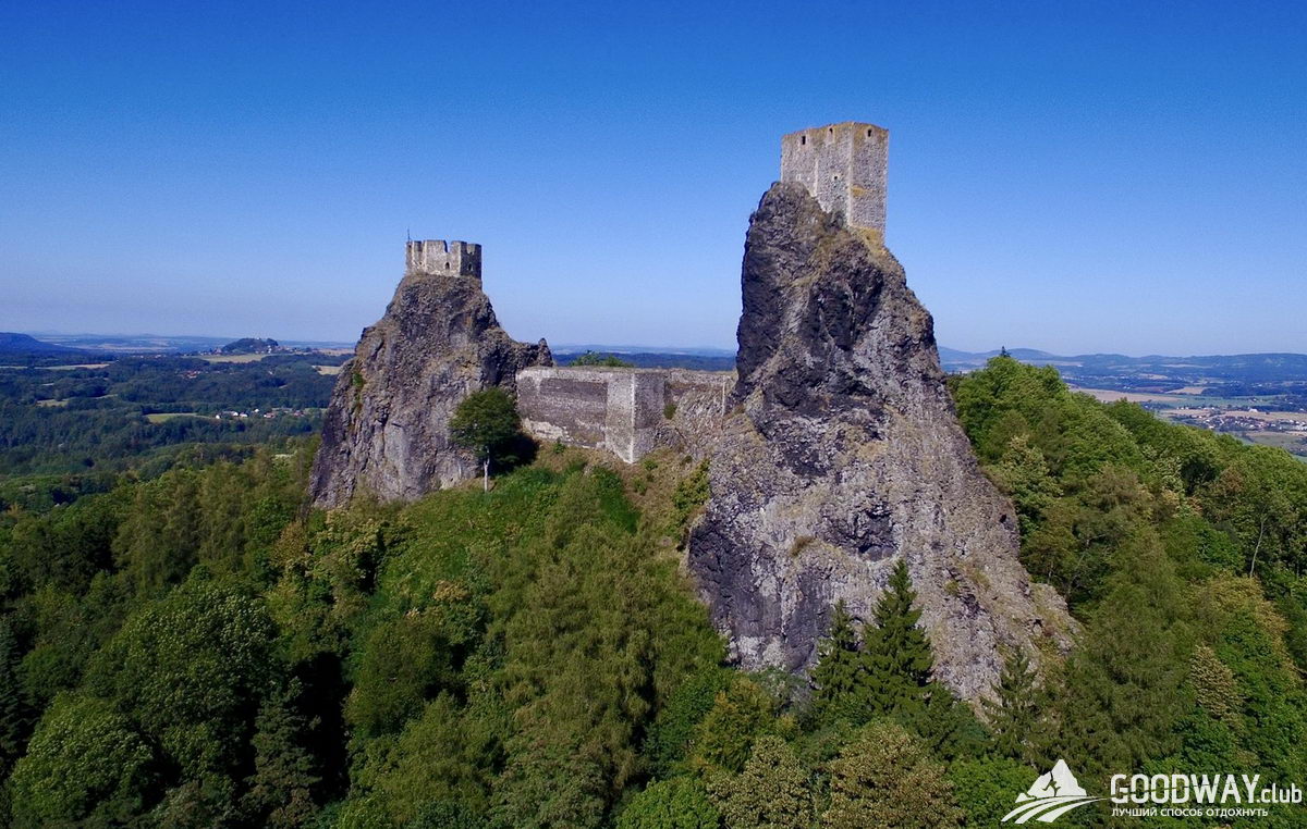 Самое интересное припасено на последний день! Праховские скалы считаются самыми-самыми красивыми в Чешском раю. Вы в этом убедитесь. А крепость Троски — это и вовсе символ парка. Именно её две башни вы увидите на заглавных картинках книжек путеводителей. Эти две башни вы уже видели несколько раз из-далека, и наконец мы здесь побываем! Башни построили в 14 веке на естественных скалах, а собственно крепость расположилась между ними. Угрожающе – неприступная крепость, неплохо сохранилась.