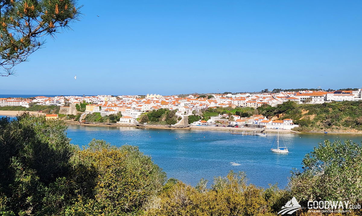 Замбужейра это самый гламурный посёлок на нашем пути. Если все остальные городки расположились на некотором расстоянии от океана, то крайние улицы Замбужейры – это набережная, идущая по краю скал, и спускающаяся на пляж. Главная площадь просто вклинивается в набережную. Закаты тут также божественные! Можно понаблюдать за концом дня с террасы ресторана, вкушая морские деликатесы. Или снова на пляже, кому как интереснее.