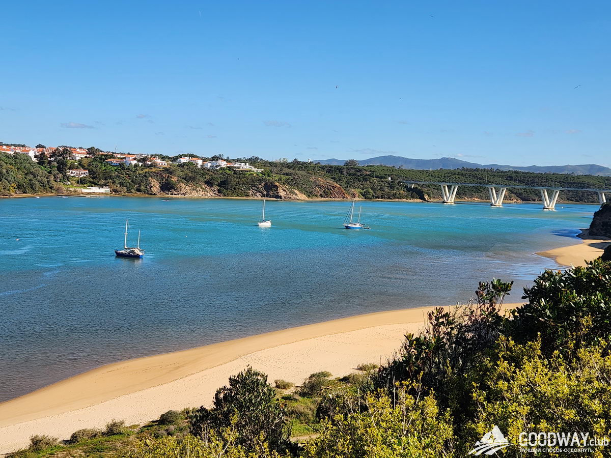 Песка сегодня не много, и расстояние меньше. Расслабимся после вчерашнего. Сначала удалимся от океана, чтобы перейти широкое устье реки Мира по мосту. Он высокий и вид с него зачётный. Также, получим прекрасный вид на город и океан с другого берега. Много теряют те, кто за 5 евро сокращают путь, переправляясь через залив на катере. Заодно они сокращают себе и великолепные виды.