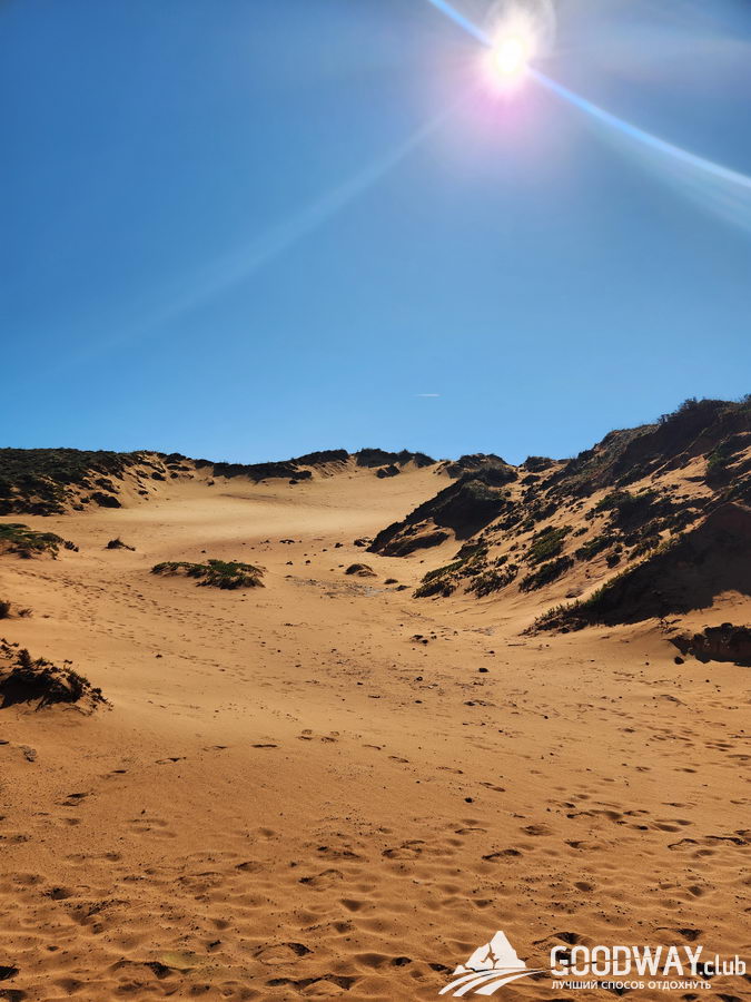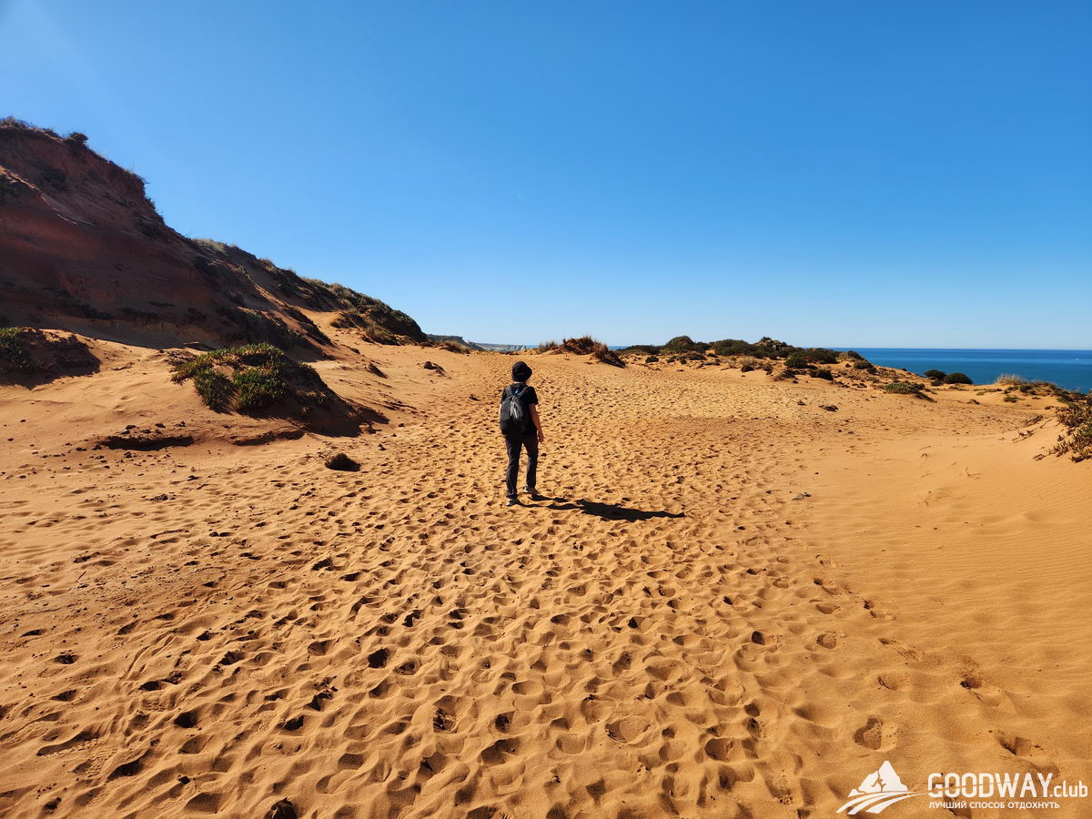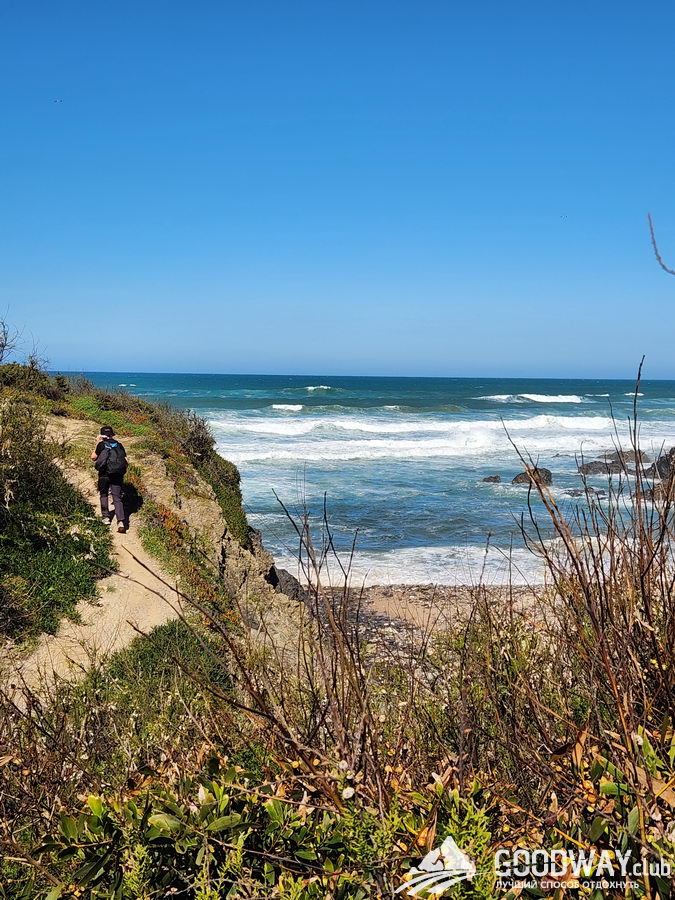 Сегодняшний день, пожалуй, самый сложный. Расстояние не большое, но 70% будет по песку. Зато это и самый видовой день! Бухты, пляжи, скалы, гроты, и всё в окружении дикой природы. Ещё нас порадуют песчаные дюны, и когда океан будет за ними скрываться, то возникнет ощущение, что мы в пустыне.